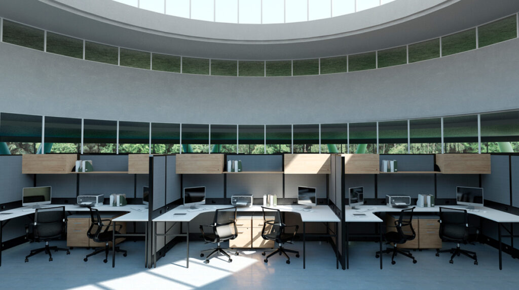 La distribución del mobiliario de oficina en una oficina pequeña es esencial para una circulación fluida y una sensación de amplitud. Coloca los escritorios cerca de las ventanas para aprovechar la luz natural y crear una sensación de apertura. Utiliza particiones bajas o muebles bajos para crear divisiones sutiles entre áreas sin bloquear visualmente el espacio.