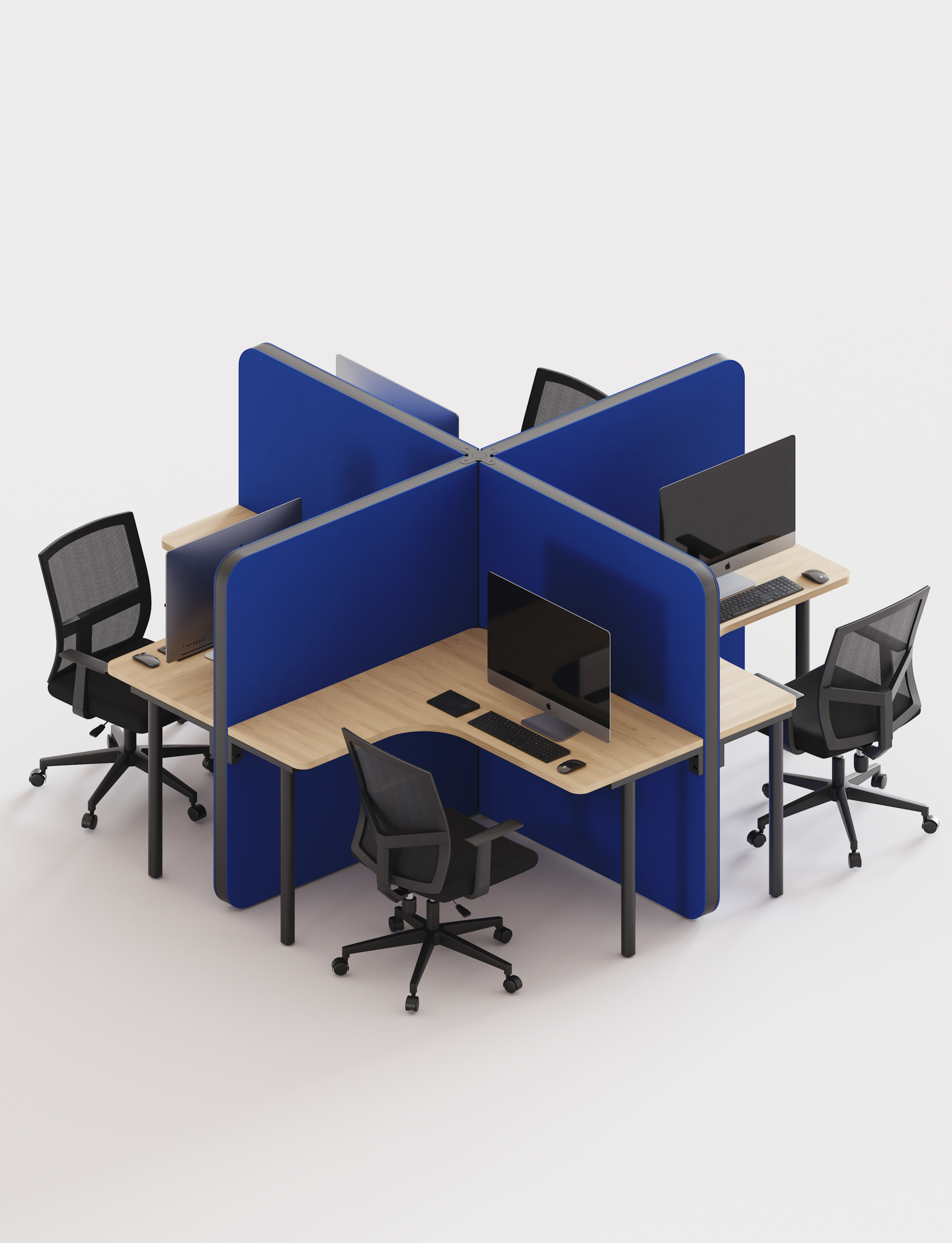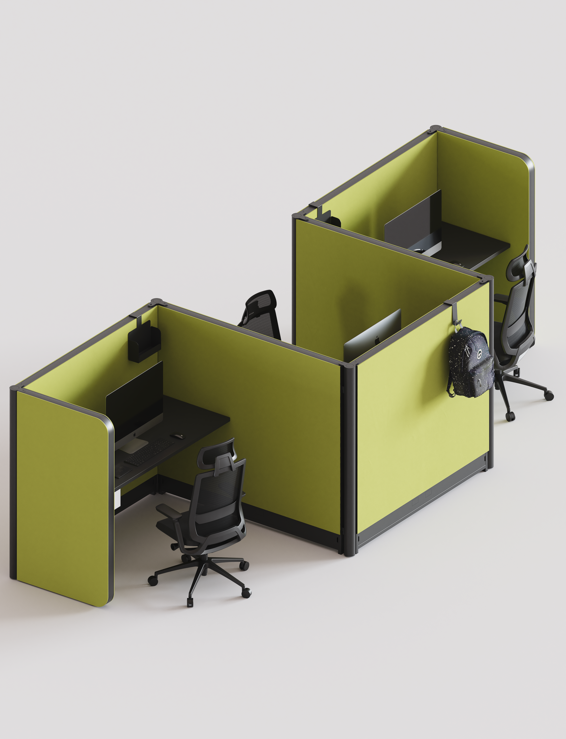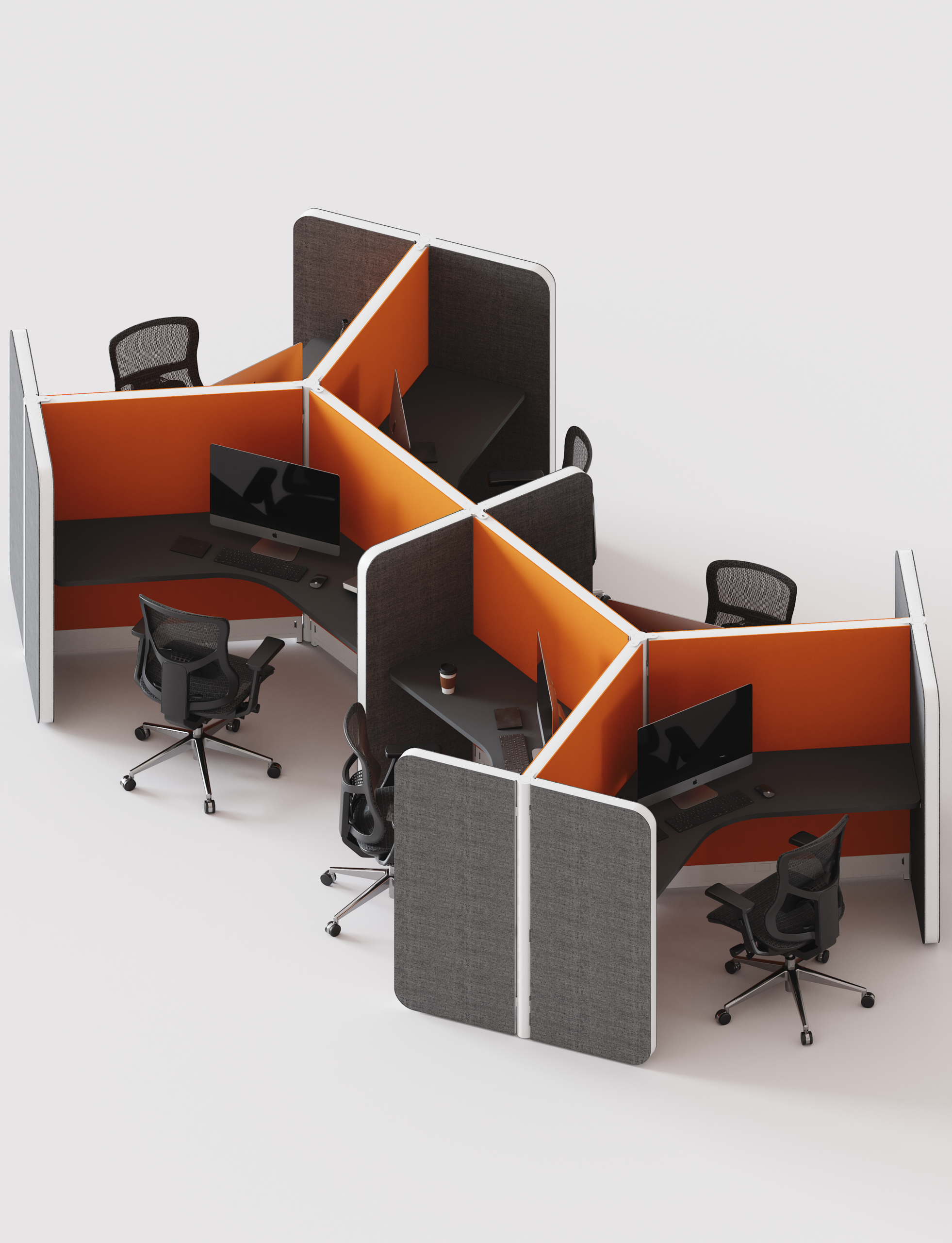 Its design is distinguished by a simplified structure, with fewer parts and agile assembly that fuses functionality with a sober and elegant aesthetic. Thanks to the blend of textiles, acoustic surfaces, and an open configuration, it offers a harmonious solution that naturally adapts to the dynamism of modern offices.